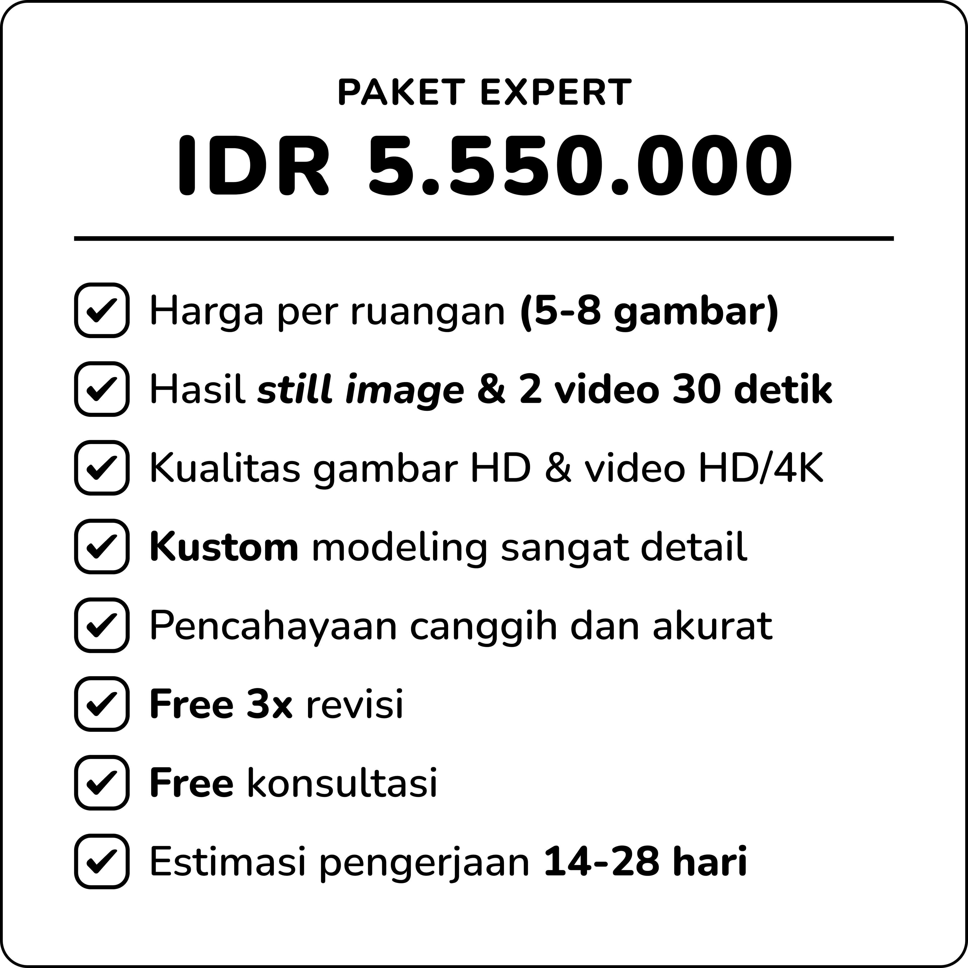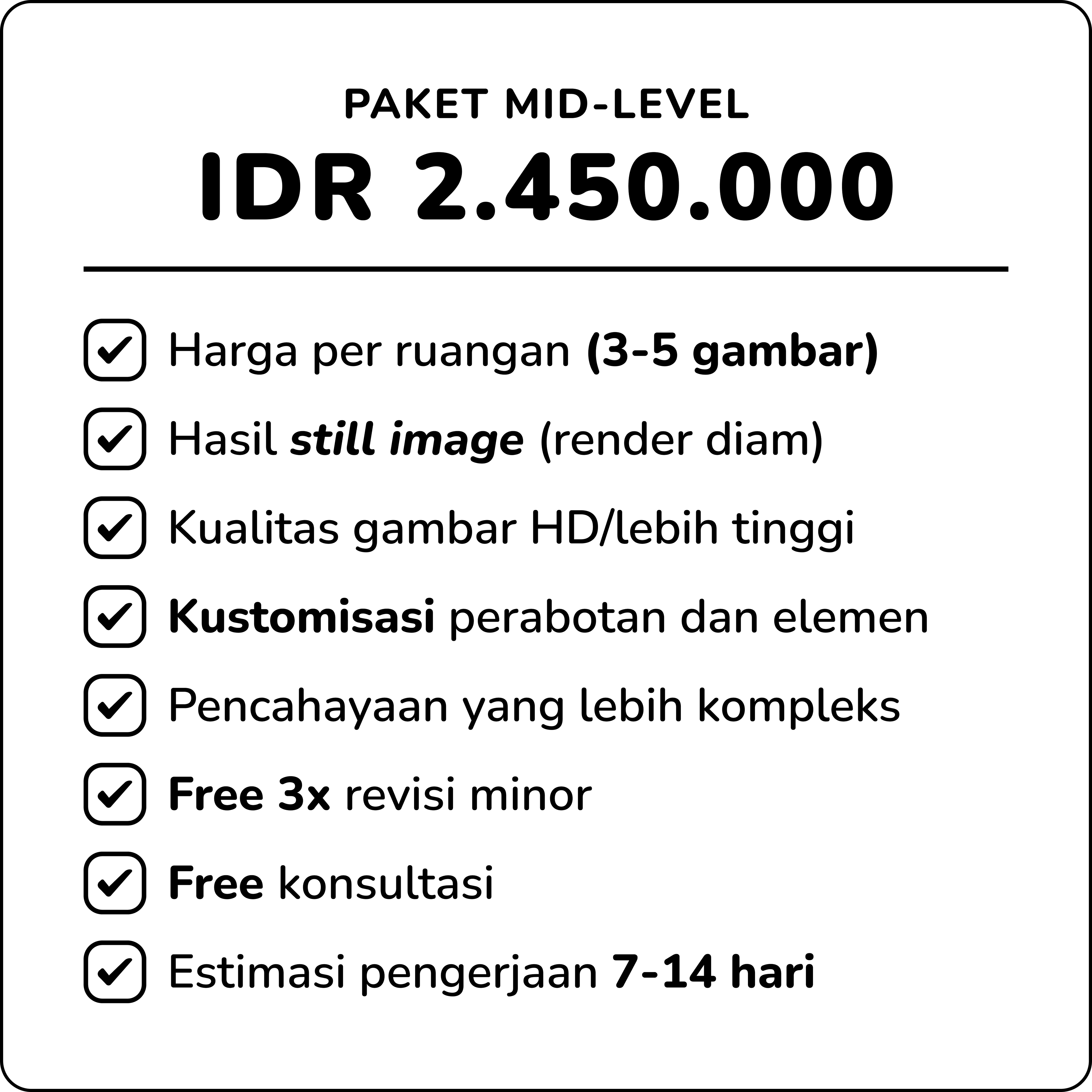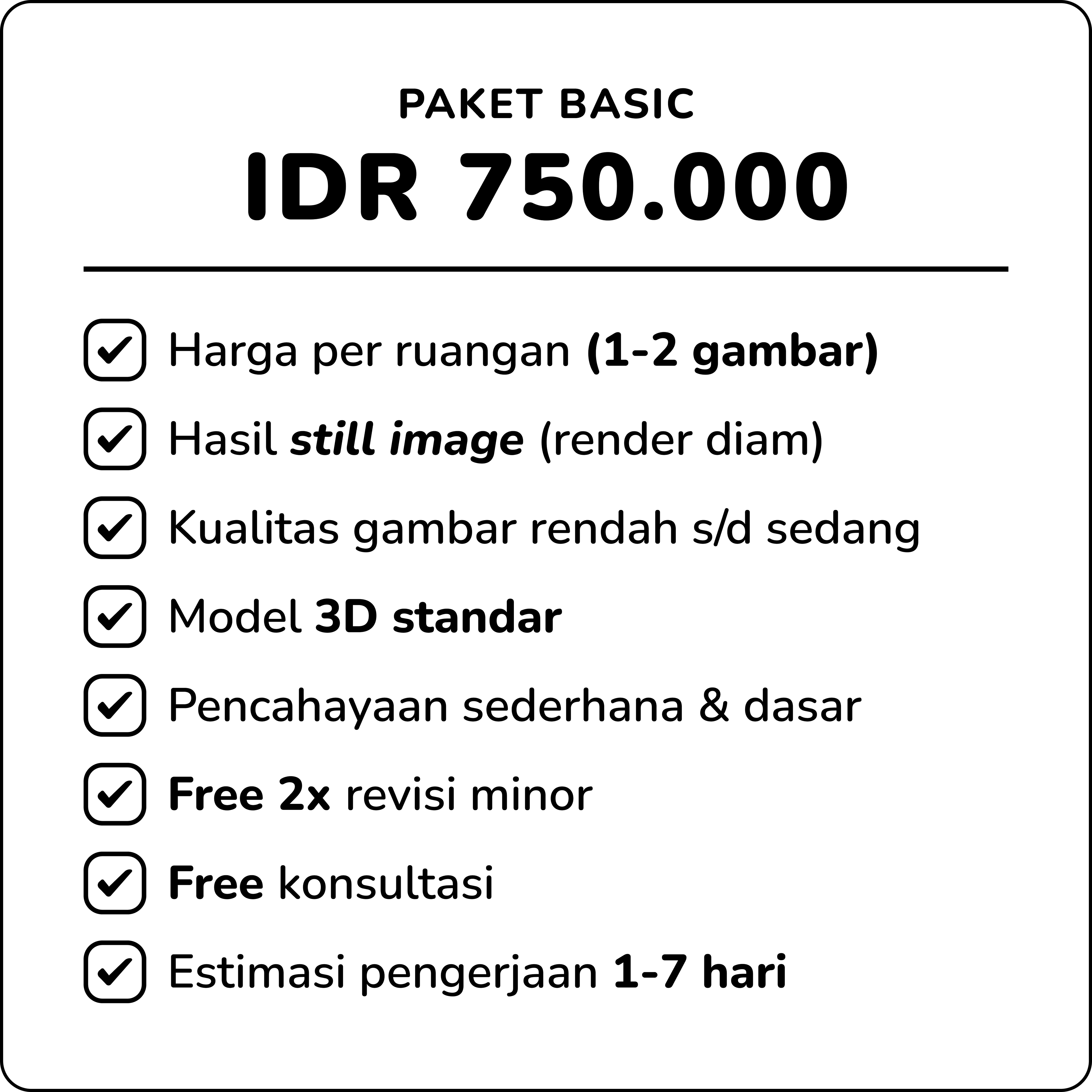 Kami membantu Anda mewujudkan visi desain interior menjadi realitas visual yang menakjubkan dan tak terlupakan. Dengan keahlian dalam visualisasi 3D dan pemahaman mendalam tentang estetika ruang, kami mengubah setiap ide Anda menjadi rendering fotorealistik yang menawan. Anda tidak hanya mendapatkan gambar teknis yang rapi, tetapi juga pengalaman imersif yang menggambarkan suasana, pencahayaan, dan tekstur secara detail. Percayakan visualisasi proyek Anda kepada kami untuk hasil yang personal, berkualitas, dan berdampak nyata bagi presentasi dan pengambilan keputusan klien Anda.