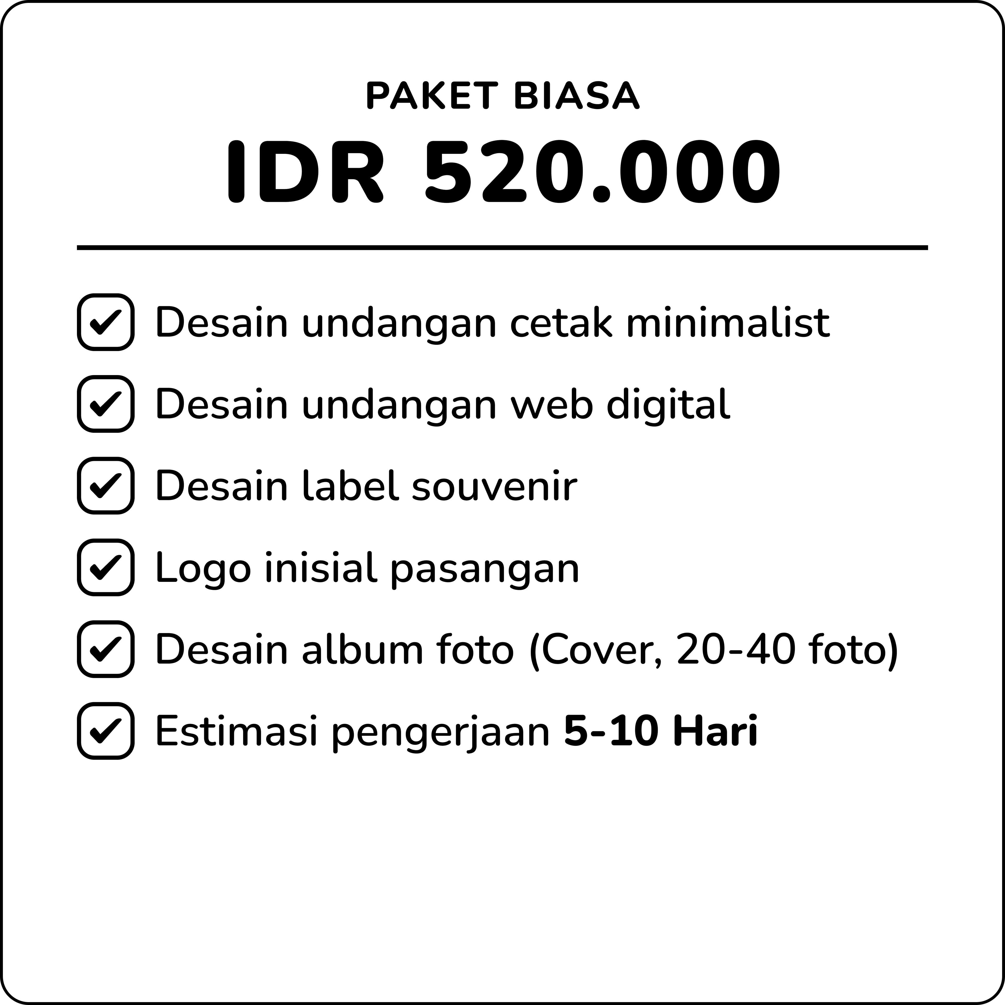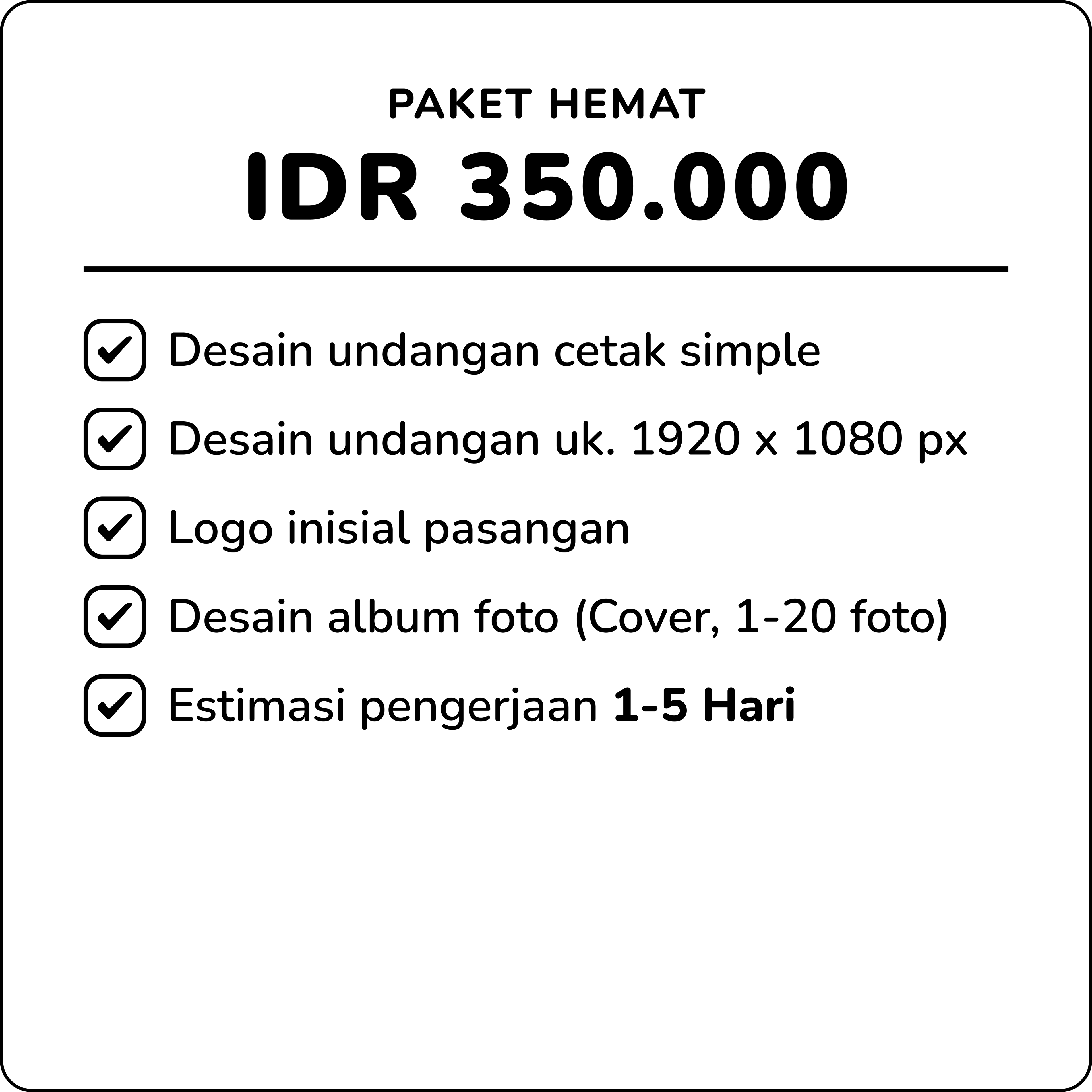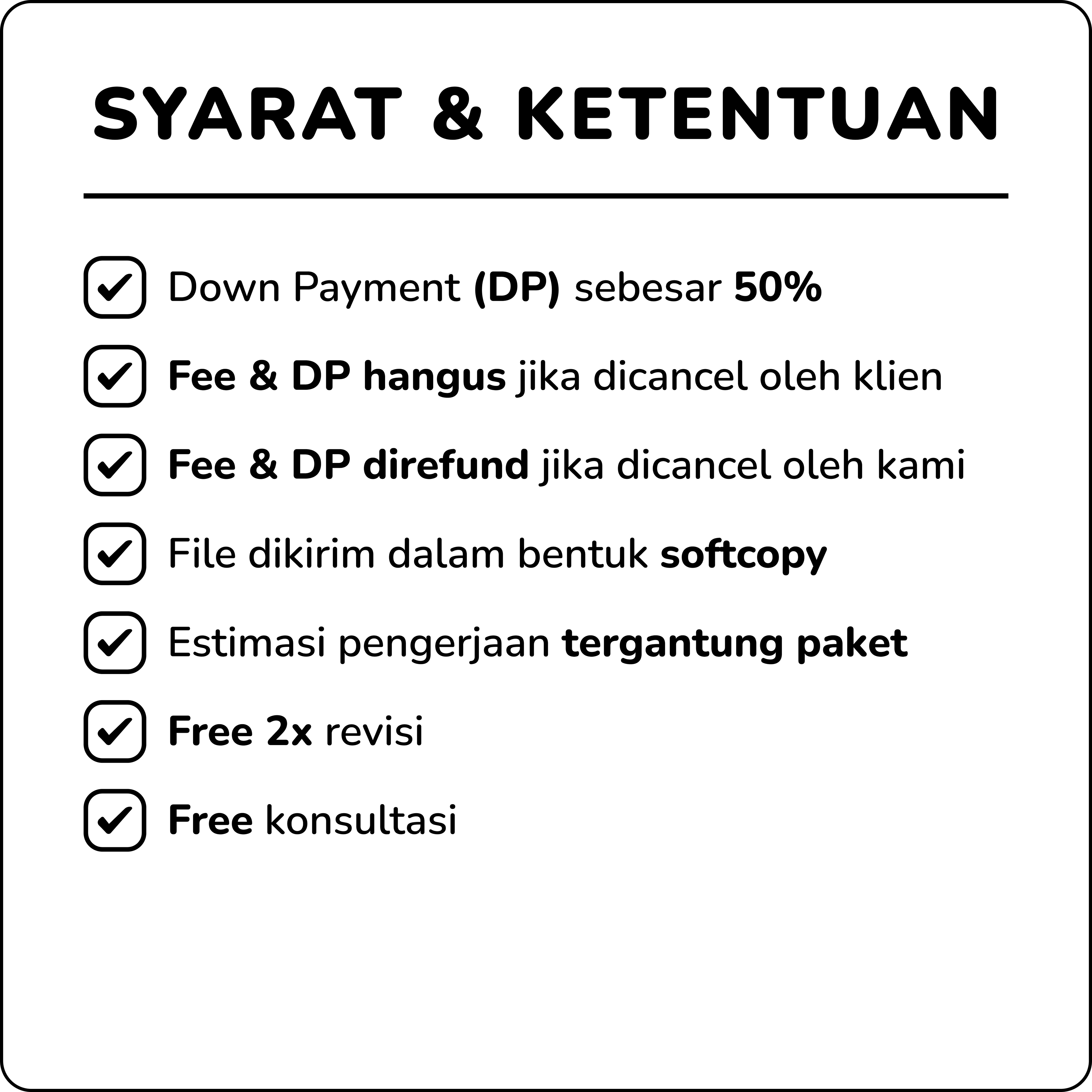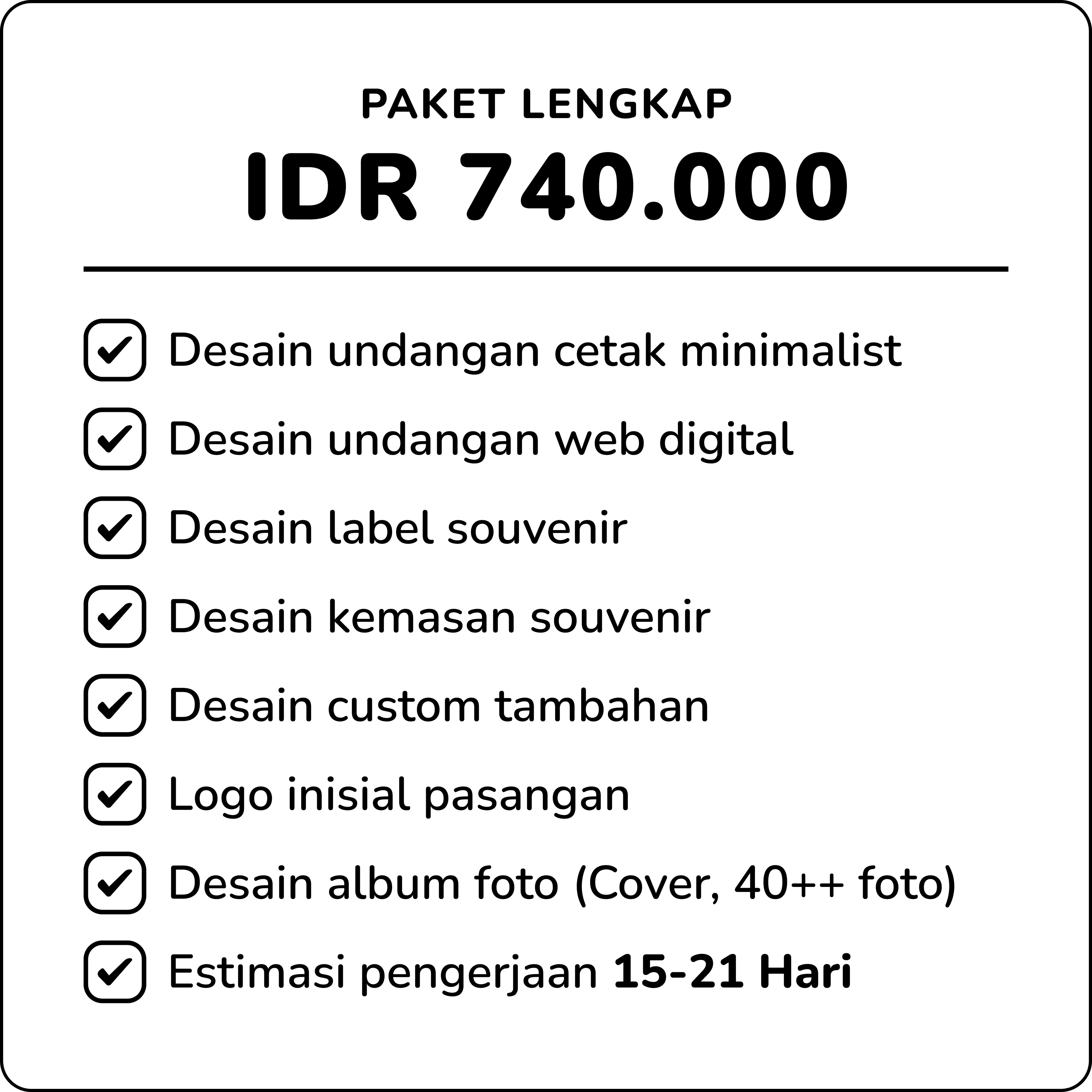 Kami menawarkan jasa desain komplit untuk pernikahan yang mempermudah persiapan Anda. Setiap detail diperhatikan, mulai dari undangan, buku tamu digital, logo, hingga kartu ucapan, dan lainnya. Dengan layanan kami, Anda mendapatkan desain yang tidak hanya indah dan fungsional, tetapi juga identitas visual yang personal dan berkesan. Seluruh aset digital dapat Anda gunakan untuk berbagai keperluan, baik disebarkan secara digital, dicetak, maupun menjadi kenang - kenangan berharga yang akan selalu diingat.