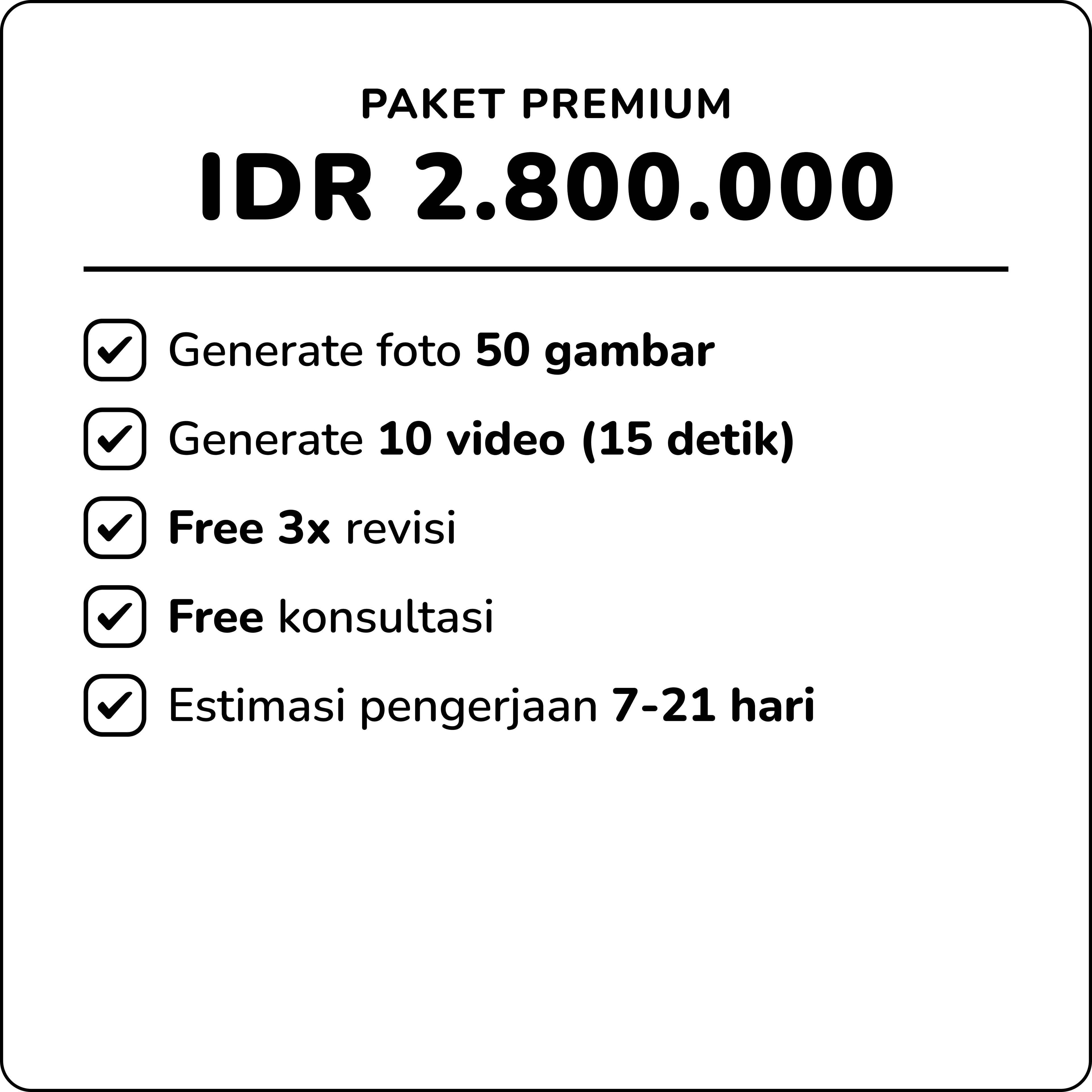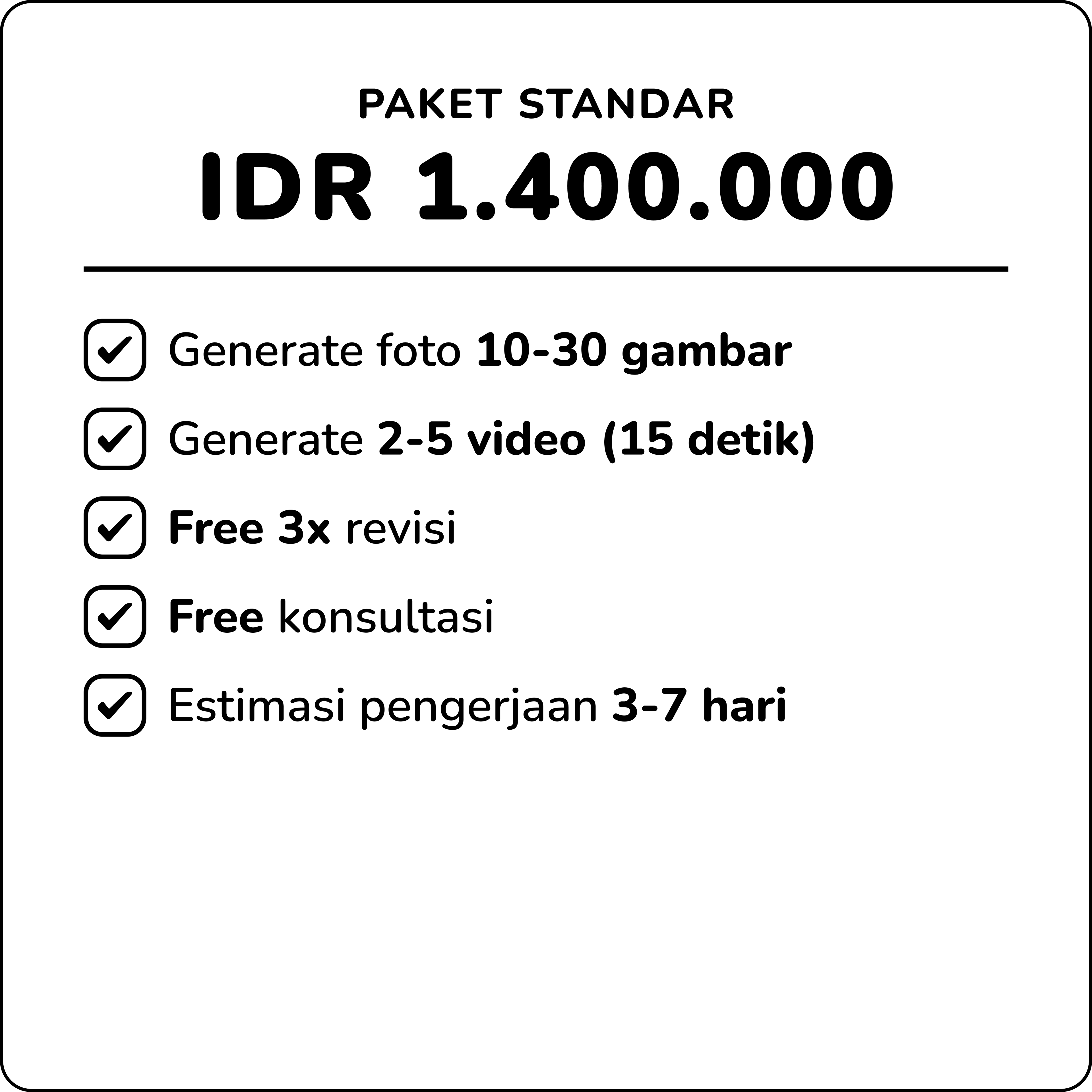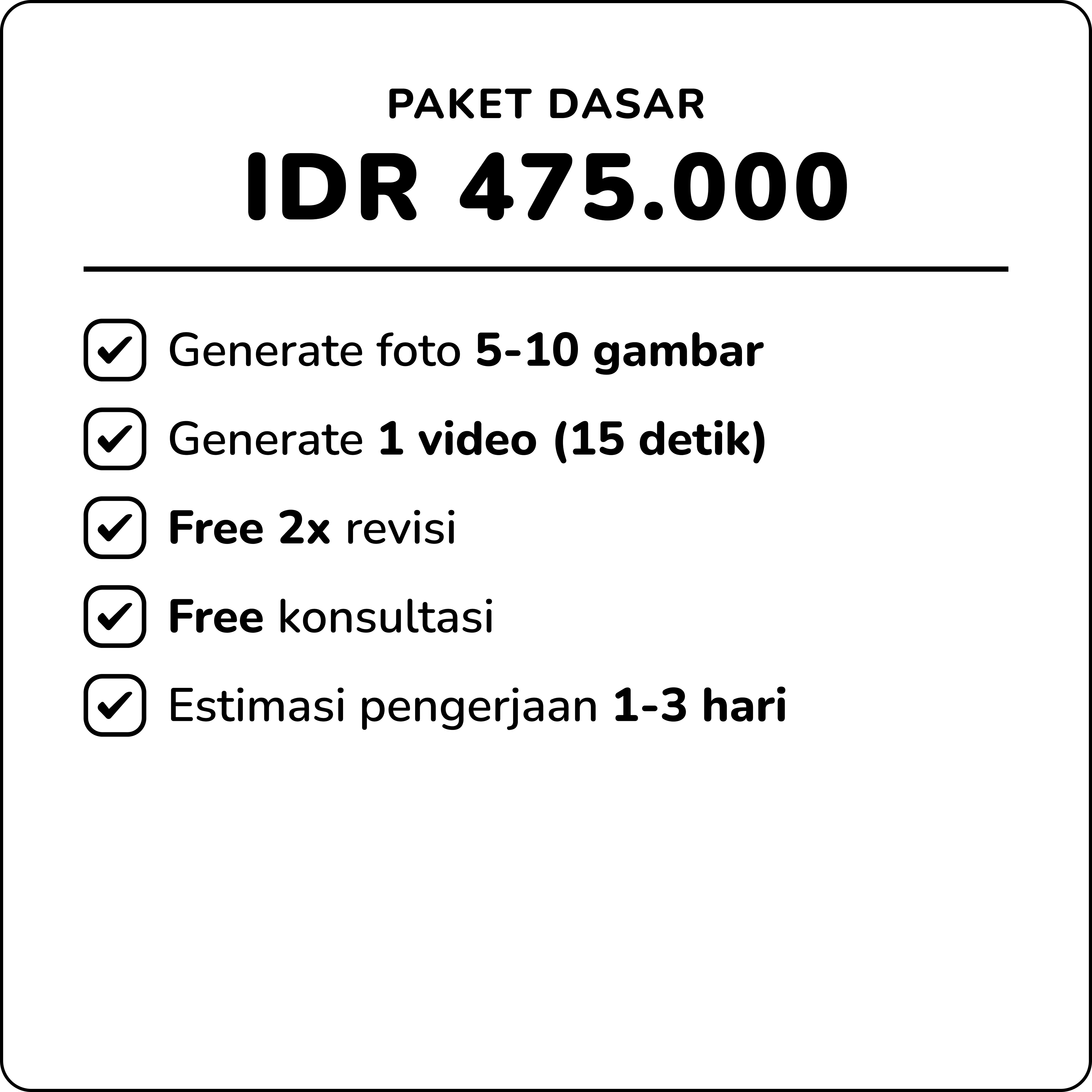 Kami membantu Anda mengubah ide dan imajinasi menjadi karya visual yang unik dan inovatif. Dengan keahlian dalam perancangan model AI, kami akan mewujudkan setiap kebutuhan konten Anda menjadi gambar dan video yang menarik dan berkesan. Anda akan mendapatkan lebih dari sekadar output dari AI. Kami akan membantu Anda menentukan prompt yang tepat, mengeksplorasi berbagai gaya visual, dan menghasilkan konten yang selaras dengan persona brand Anda. Percayakan kebutuhan konten Anda kepada kami untuk hasil yang personal, berkualitas, dan berdampak nyata bagi bisnis Anda.