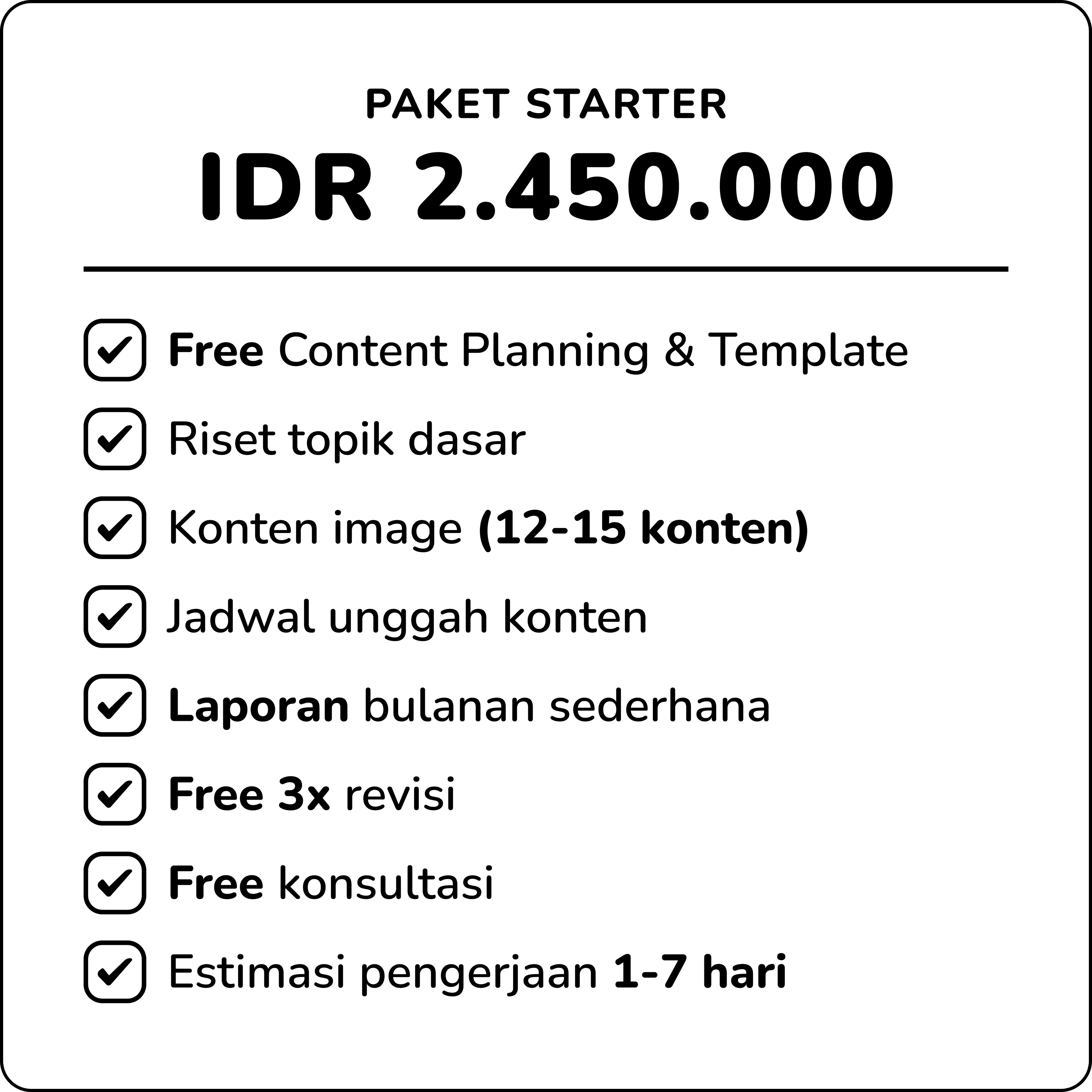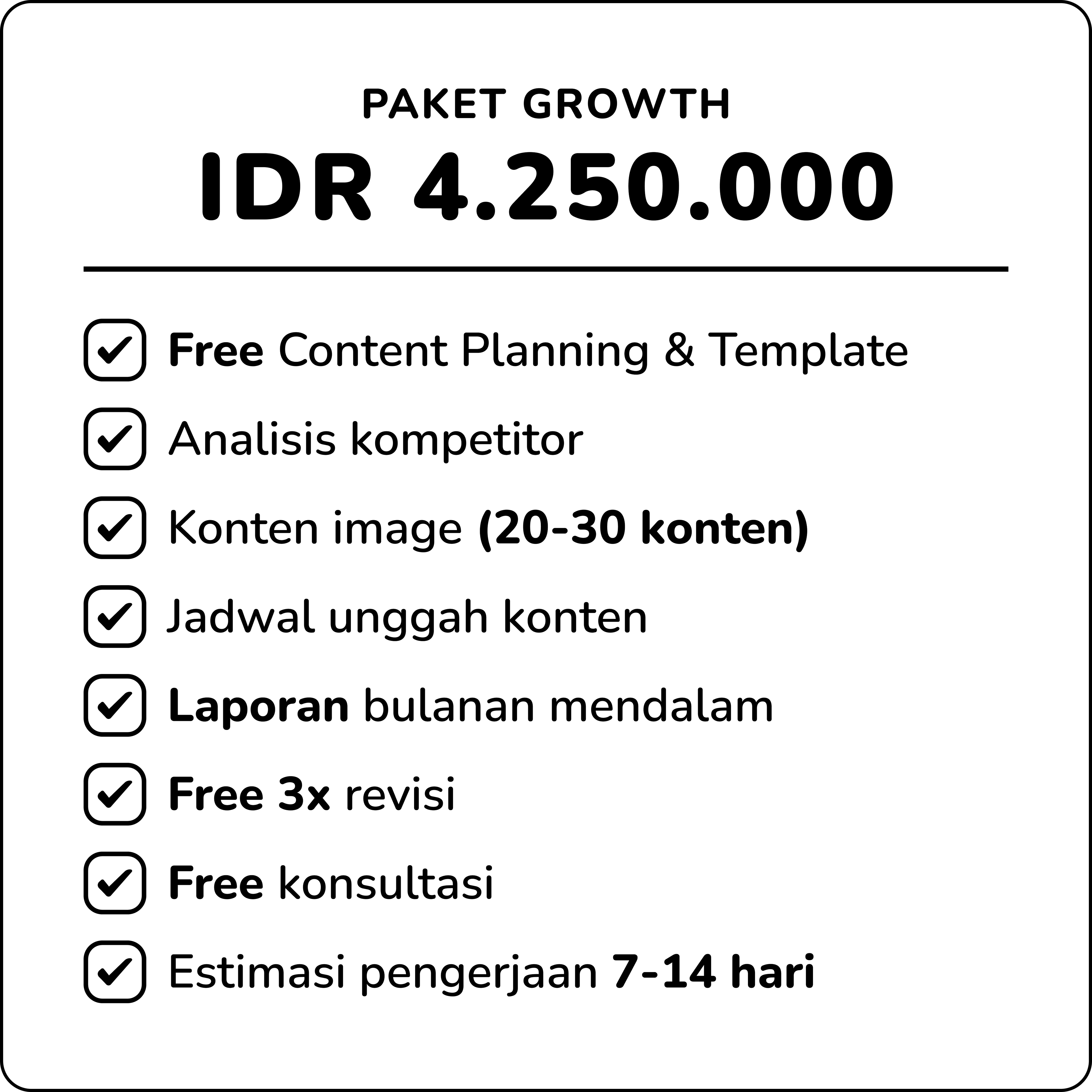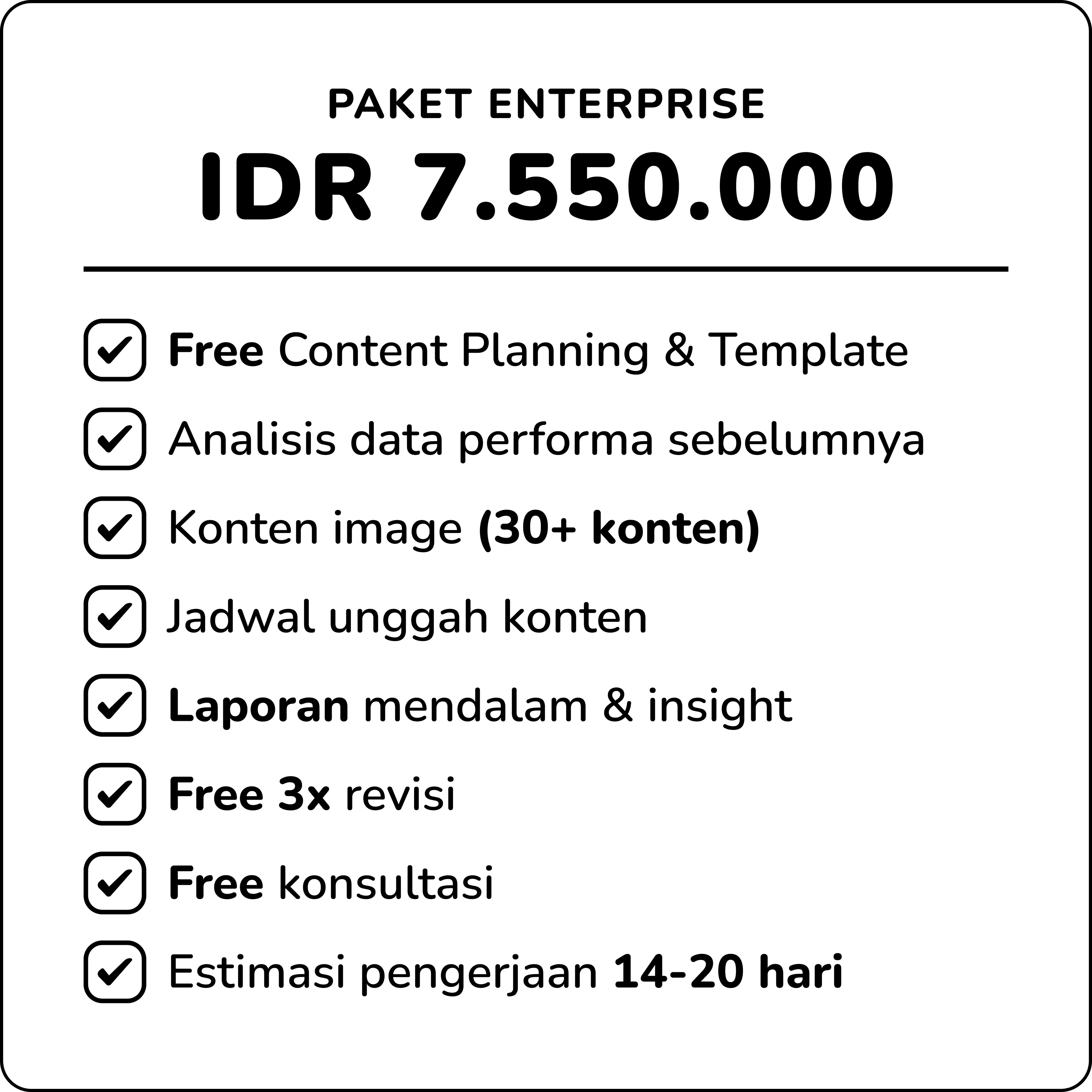 Kami membantu Anda membangun kehadiran digital yang kuat dan tak terlupakan di media sosial. Dengan keahlian dalam strategi konten dan interaksi audiens, kami mengubah setiap aspirasi Anda menjadi strategi media sosial yang terstruktur dan postingan yang menarik. Anda tidak hanya mendapatkan akun media sosial yang terkelola dengan rapi, tetapi juga interaksi yang bermakna dan pertumbuhan audiens yang loyal. Percayakan pengelolaan media sosial Anda kepada kami untuk hasil yang personal, berkualitas, dan berdampak nyata bagi bisnis Anda.